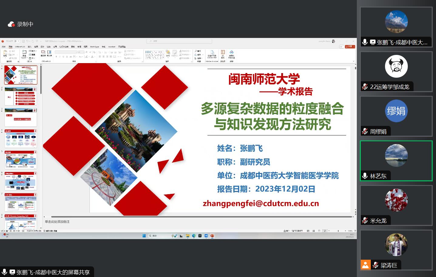应我院邀请,12月2日,成都中医药大学张鹏飞副研究员在腾讯会议作了题为《复杂数据的粒度融合与知识发现方法研究》的报告。相关师生聆听了此次报告,报告由林艺东老师主持。