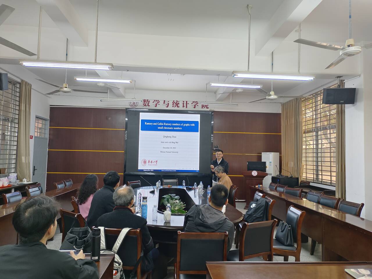 应我院邀请,12月28日上午,华侨大学赵庆红博士在砺志楼114作了题为《Ramsey and Gallai-Ramsey numbers of graphs with small chromatic numbers》的报告。相关师生聆听了此次报告,报告由卢福良老师主持。