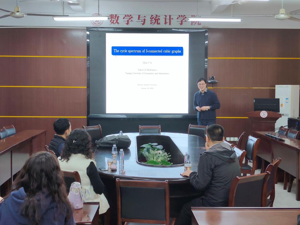 应我院邀请,1月14日上午,南京航空航天大学崔庆教授在砺志楼114作了题为《The cycle spectrum of 3-connected cubic graphs》的报告。相关师生聆听了此次报告,报告由卢福良老师主持。