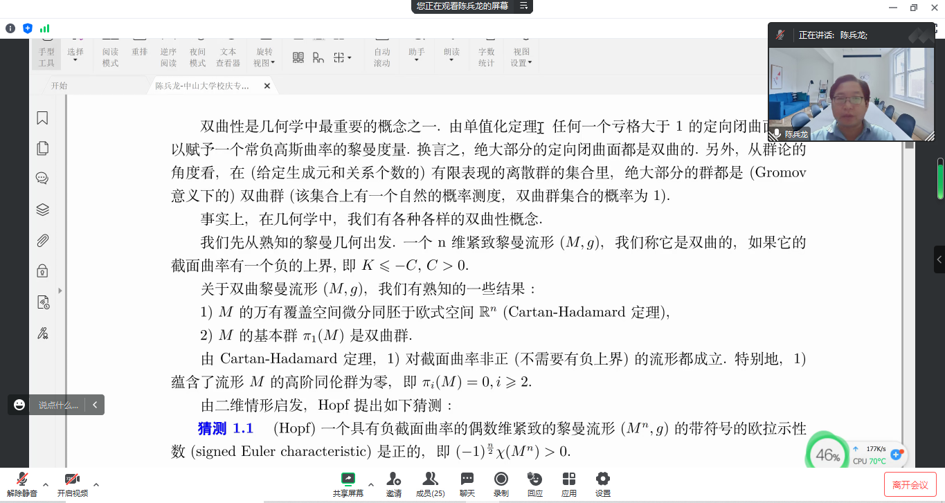 应我院邀请,4月11日晚上,中山大学陈兵龙教授在腾讯会议作了题为《几何中的双曲性与基本群》的报告。相关师生聆听了此次报告,报告由黄韩亮、吴晓锋老师主持。