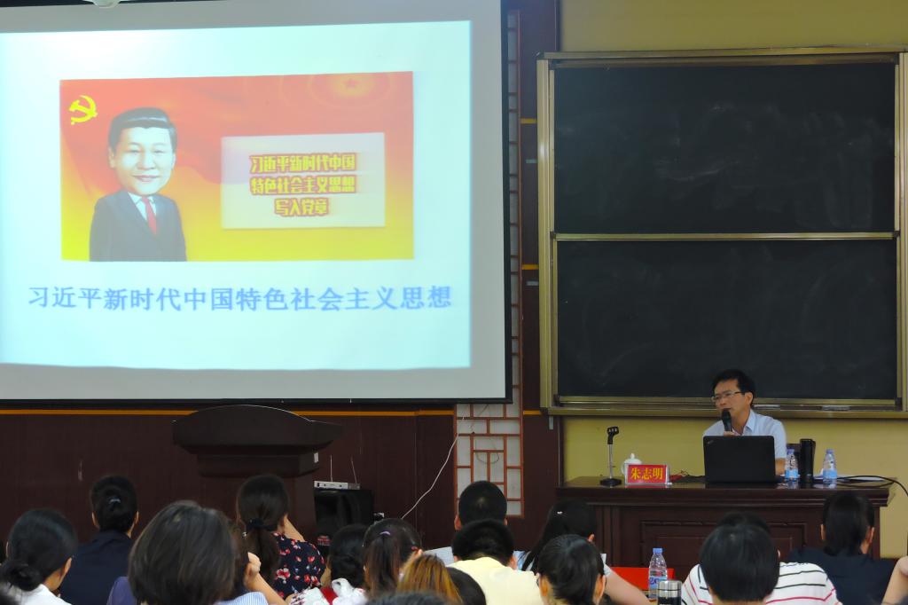 为深入学习贯彻习近平新时代中国特色社会主义思想,更好地学习领会其核心要义和精髓,以高度的思想和行动自觉学习贯彻“新思想”,6月14日下午,我院在砺志楼120组织开展学习习近平新时代中国特色社会主义思想宣讲活动。我校学习教育宣讲团成员、马克思主义学院党委书记朱志明教授作题为《习近平新时代中国特色社会主义思想研究》的宣讲。学院全体教工党员、学生党员以及入党积极分子参加活动。