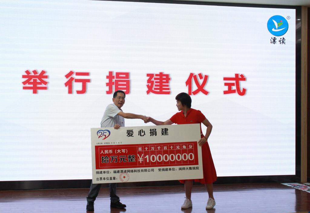 在捐赠仪式上,福建漂读网络科技有限公司董事长柯桂香代表92级数专向学院捐献拾万元,主要用以支持学院学科、教学、科研的基础建设。林梦雷代表学院对校友感恩母校、情系闽师、慷慨捐赠的善举表示衷心感谢。他指出,校友的捐赠寄托了对母校的深情厚谊、对学生的关爱以及对教育事业的情怀。福建漂读网络科技有限公司与数学与统计学院签订战略合作协议,双方将加深校企合作,致力于高素质人才的培养,共建实践教学基地、实习实训基地和创新创业基地。