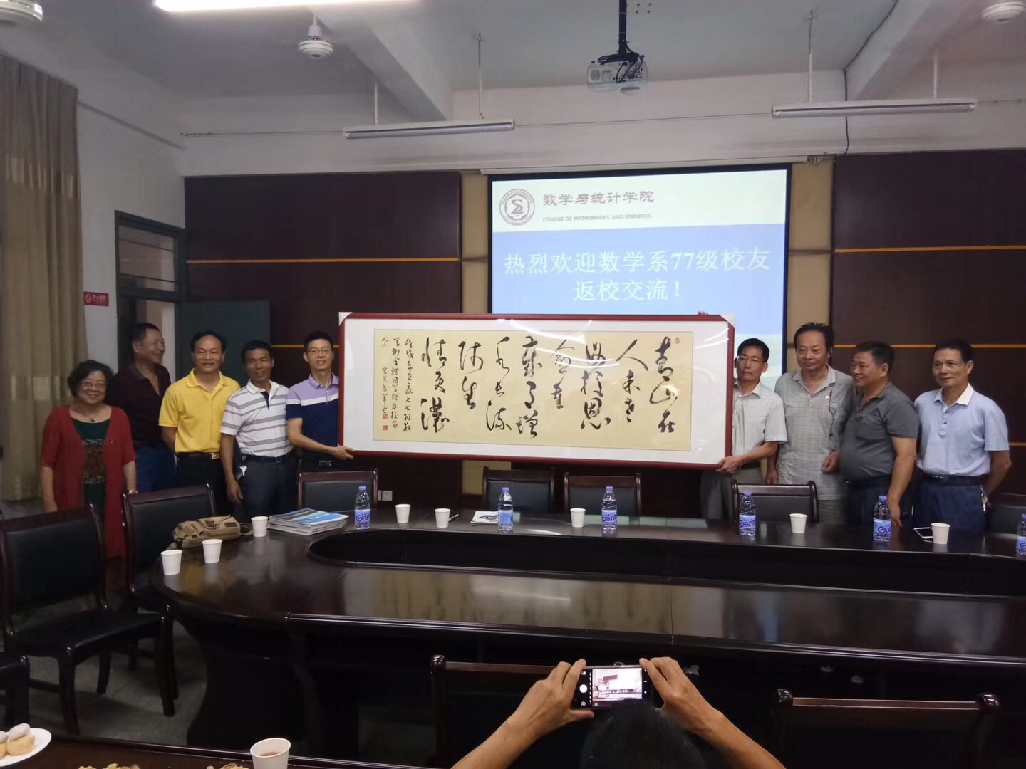 座谈会开始,77级数学班的班长带着同学们一起回忆当年求学和奋斗的艰苦历程,校友们仿佛回到当年读书的时光。接着,林梦雷院长致辞,他代表学院对77级校友的返校表达了热烈的欢迎,并介绍了学院近年来的发展。随后,校友们向母校和数统学院捐赠图书以及感恩母校的书法横匾。77级数学班的班主任老师也来到现场,大家聊起各自的人生经历,感慨万千,现场气氛温馨感人。最后大家一起到砺志楼前合影留念。