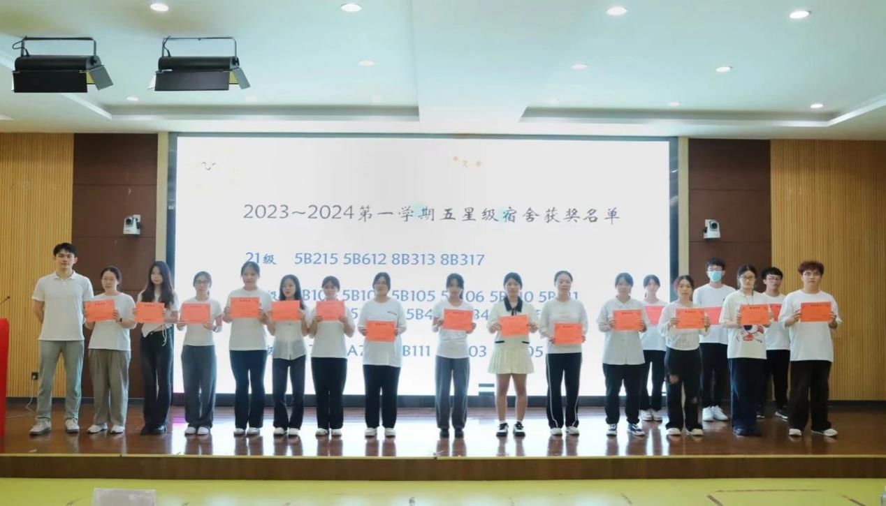 会场还向舍长们展示了五星级宿舍内务整洁的图片,以此向在座同学强调宿舍环境整洁、赏心悦目的重要性。随后,由石伟琦老师为2023-2024学年获奖宿舍进行颁奖,并鼓励在座舍长向五星级宿舍和学风宿舍看齐,向高标准努力,带领宿舍成员共同营造一个整洁温馨、积极向上的宿舍文化氛围。