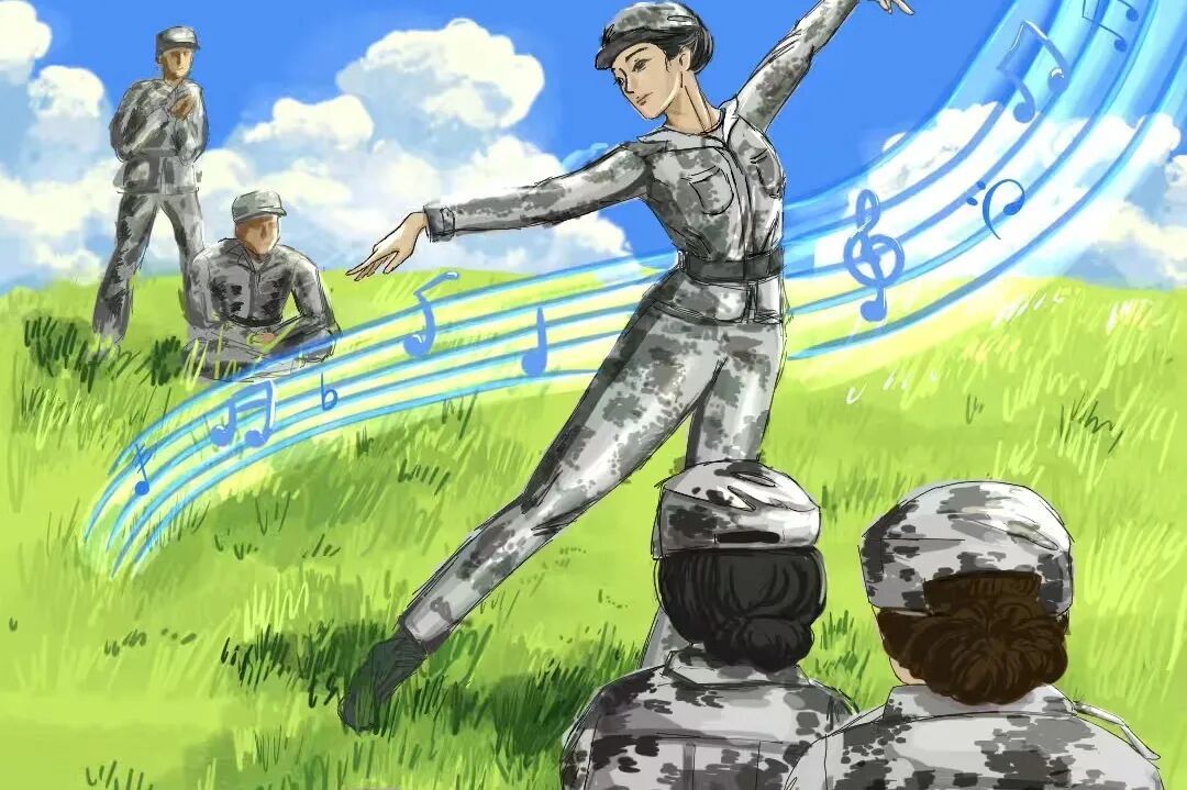 蓝天下,她舞着迷彩,蓝色音符顺着草尖飞;我们坐在草地看,汗水也映着蓝天的蓝,把军训跳成了清亮的蓝调。
