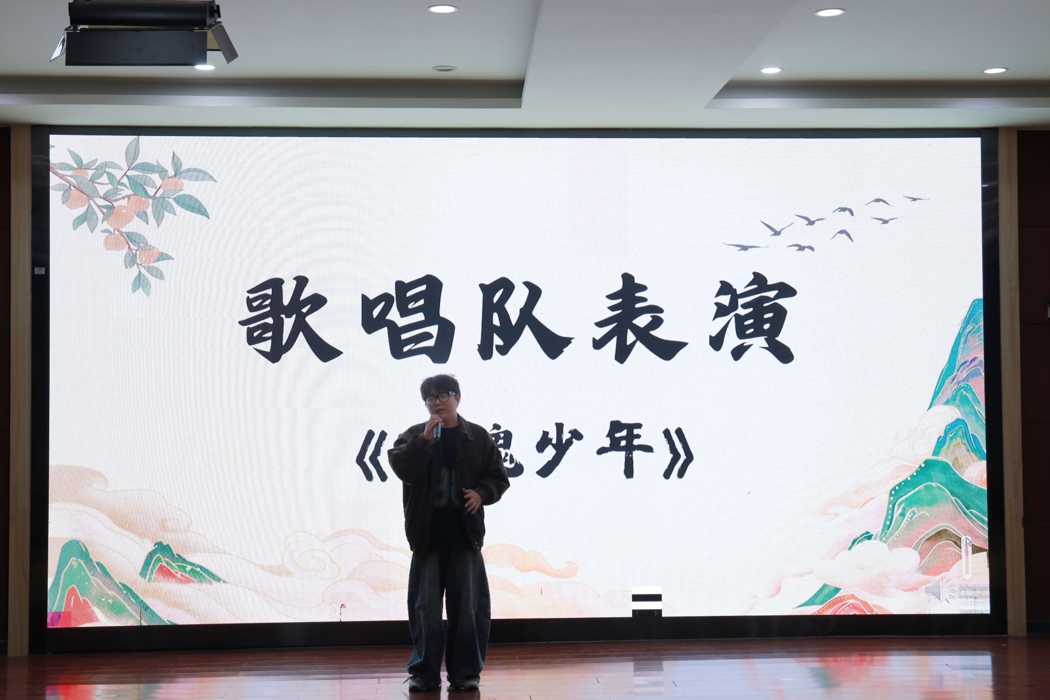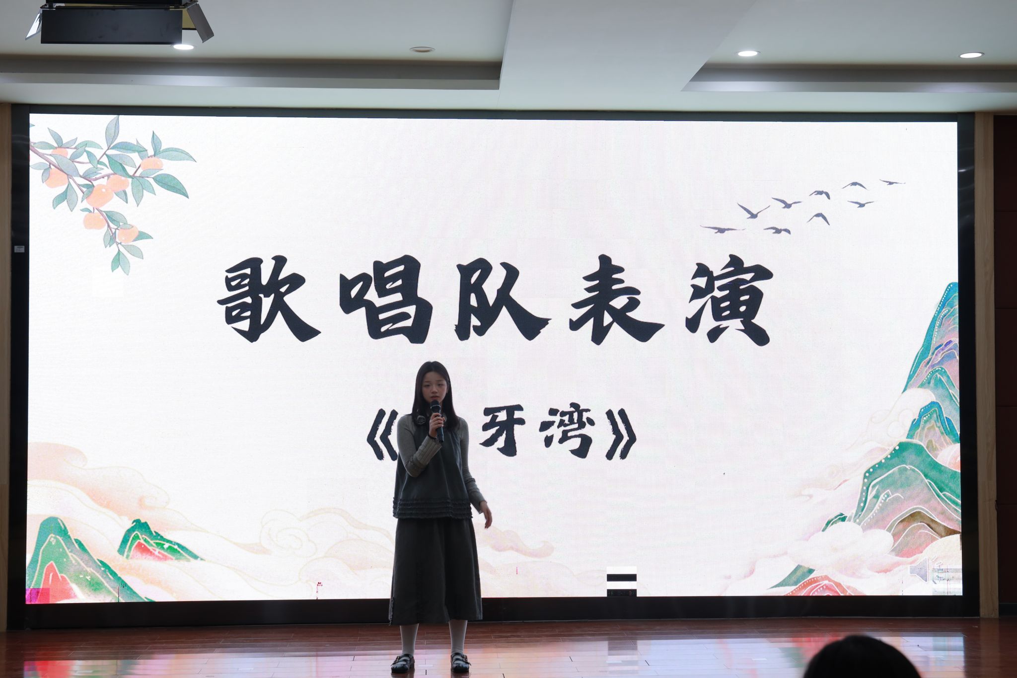 在四个班级展示结束后,学院歌唱队带来精彩表演《月牙湾》,为比赛注入清新艺术气息。宛转悠扬的歌声巧妙舒缓了现场的紧张氛围,赢得阵阵掌声。