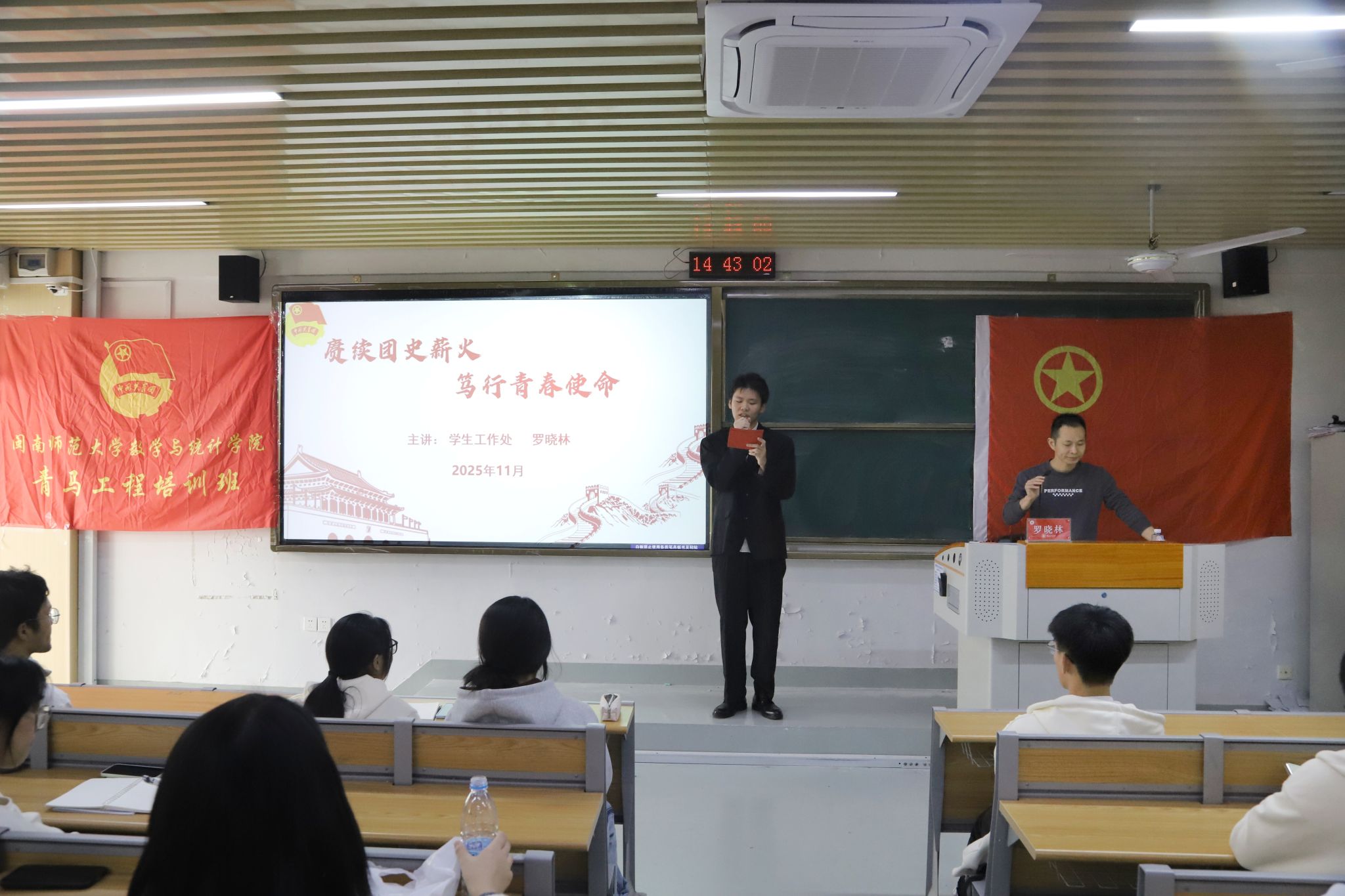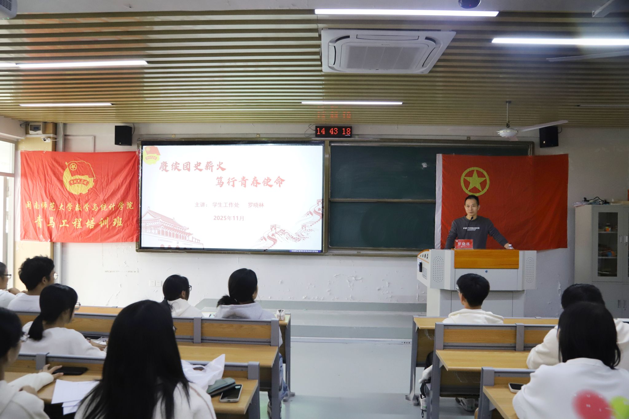 团史熠熠照初心,青春奋进担使命。作为新时代青年团员,我们应如何从百年团史中汲取精神养分,以实际行动诠释团员的责任与担当?为引导青年学子,筑牢信仰之基、勇担青春使命,近日,数学与统计学院青马工程培训班第三课《赓续团史薪火,笃行青春使命》在砺志楼224教室开讲,特邀学生工作处宣教科科长罗晓林老师倾情授课。