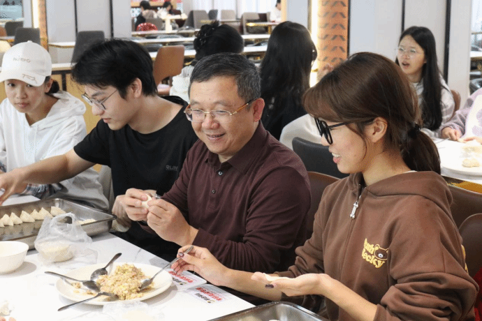 活动现场暖意融融,新鲜的饺子皮、丰富的馅料早已整齐摆放。老师们化身“暖心陪伴者”,挽起袖子与同学们并肩协作,指尖翻飞间,形态各异的饺子渐渐摆满托盘。欢声笑语中,师生间的距离悄然拉近,每一个饺子都裹着学院的关怀与师生间的情谊,成为这个冬日最温暖的注脚。