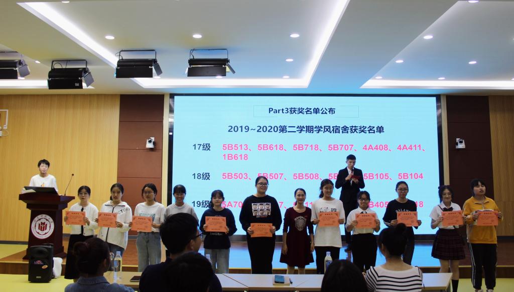 会议伊始,自律会内务部对宿舍日常卫生检查的时间与检查要求进行详细介绍,强调了宿舍规章制度的注意事项,并鼓励各宿舍积极参与宿舍美化大赛。接着督察部对学生迟归、违规电器、熄灯时间等相关制度进行说明,随后,自律会展示部分五星级宿舍的照片,公布五星级宿舍与学风宿舍获奖名单,并由参会老师为获奖宿舍代表颁发奖状。