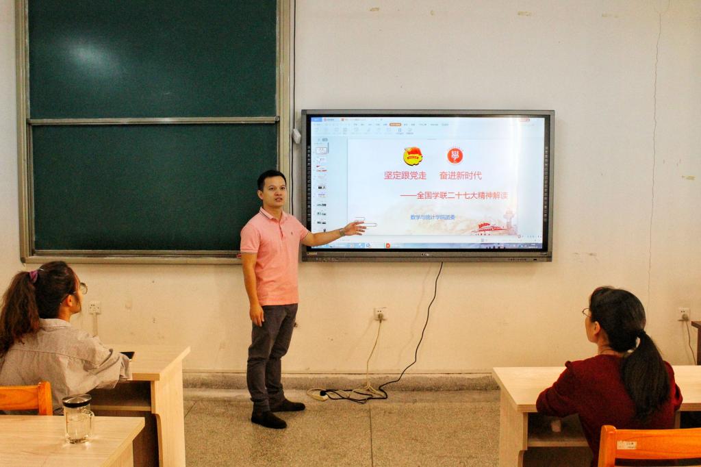 11月1日上午,我院在砺志楼105召开全国学联二十七大精神解读会,学院党委副书记林晓老师、辅导员郭彬彬老师、郑珊老师及学院学生会、研究生会主席团成员参加。