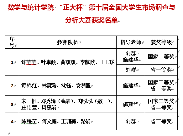 近日,由教育部高等学校统计学类专业教学指导委员会与中国商业统计学会共同主办的“正大杯”第十届全国大学生市场调查与分析大赛圆满结束。在本届市场分析调查大赛中,数学与统计学院学子表现优异,在施建华、刘群老师的指导帮助下,四支队伍荣获国家级、省级荣誉。