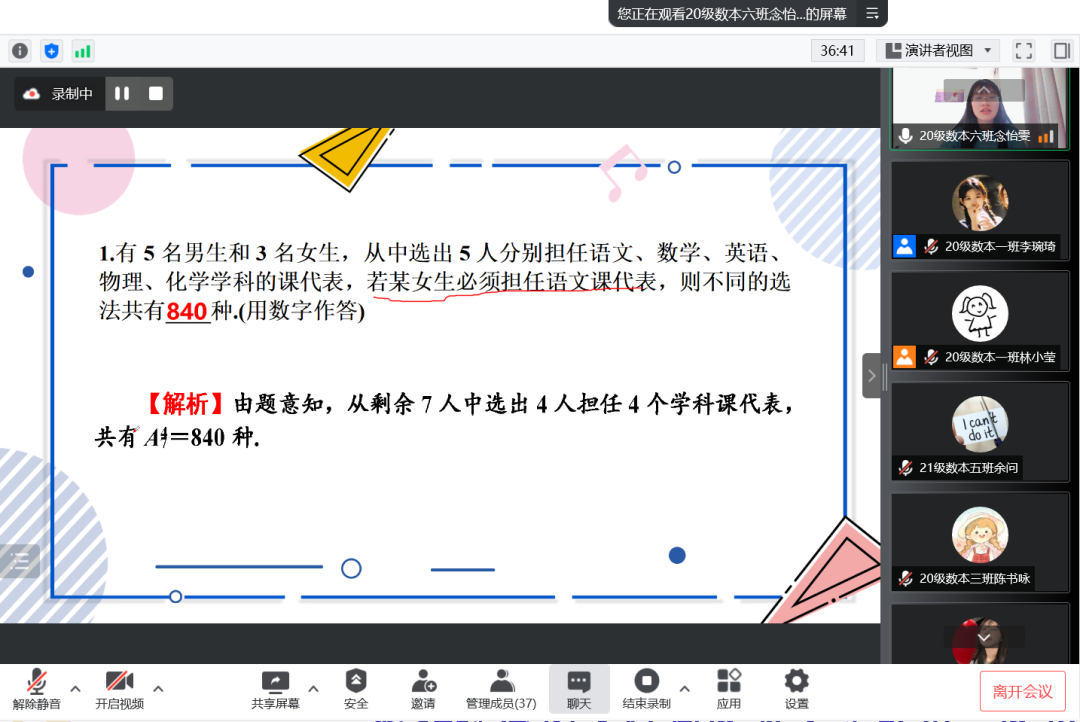 本节课堂上,实践队员由简单的分配问题引入排列的概念,再进一步深入,以题目为依托,比较树状图与排列数的优劣势。进而引出排列数概念,介绍排列数公式,强调“排列”与“排列数”的区别,最后以题目加以巩固。